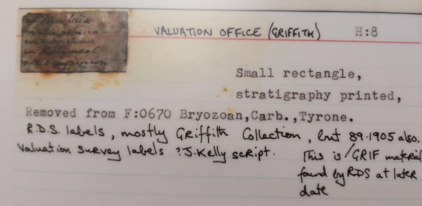 A 16 page folio catalogue in the collection contains information relating to specimens, which were donated by Sir Richard Griffith to Robert Ball of the Dublin University Museum in March 1848. These specimens represented approximately half of his cabinet. The other half which contained the bulk of the figured material of M‘Coy (1844) is now housed in the National Museum of Ireland.