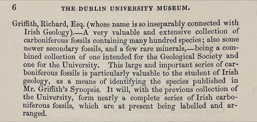 This fossil collection formed part of the cabinet of Sir Richard Griffith which Frederick M‘Coy used as the basis for his Synopsis of the Characters of the Carboniferous Limestone Fossils of Ireland, published in 1844.