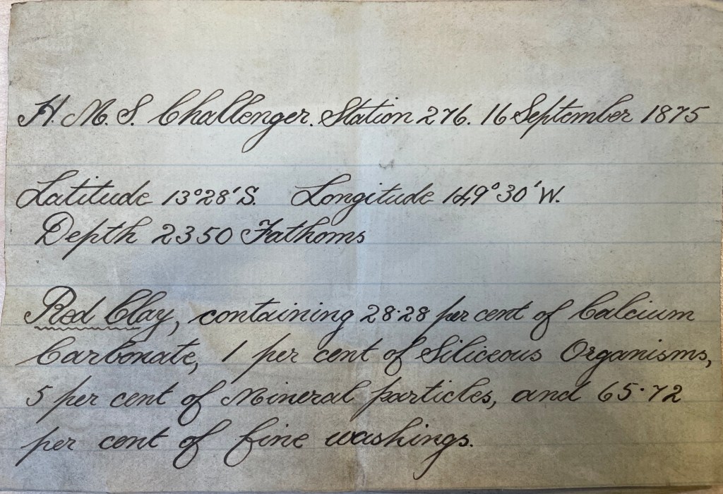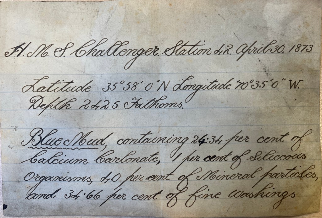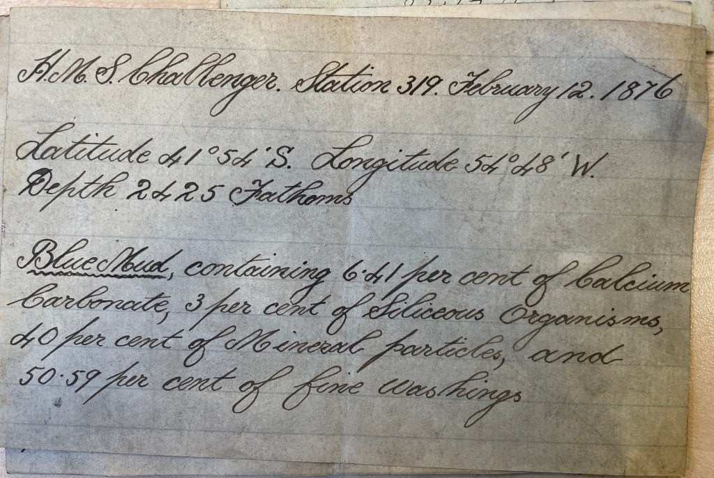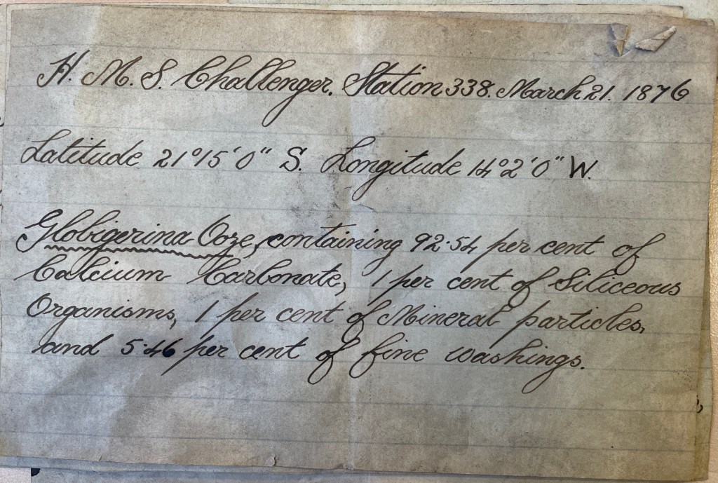 Paperwork and specimens relating to 19th century scientific expeditions: the H.M.S. Challenger (1872–76) and U.S.S. Albatross, found together in one drawer in old wooden cabinet.