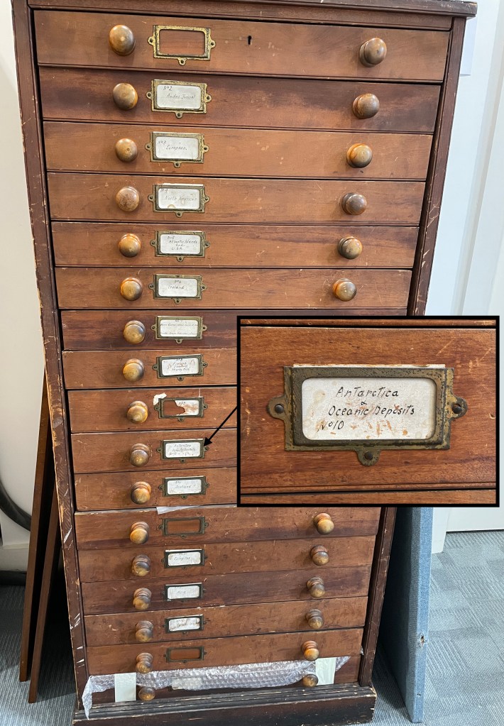 The drawer also includes rock specimens from Antarctica, from Krantz.