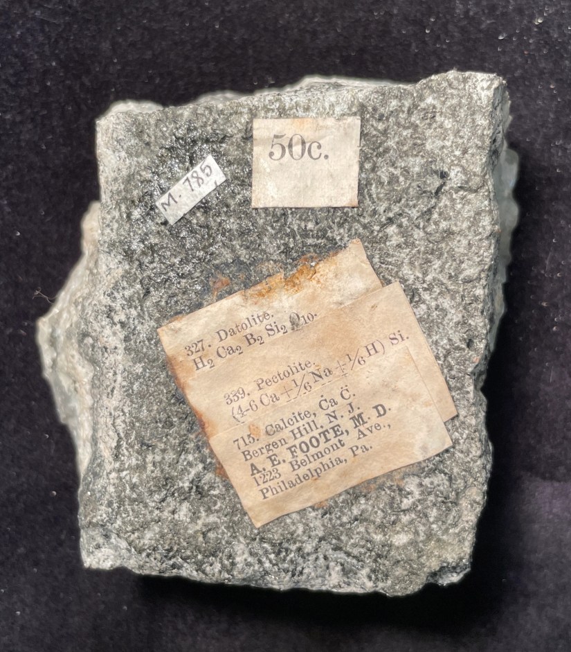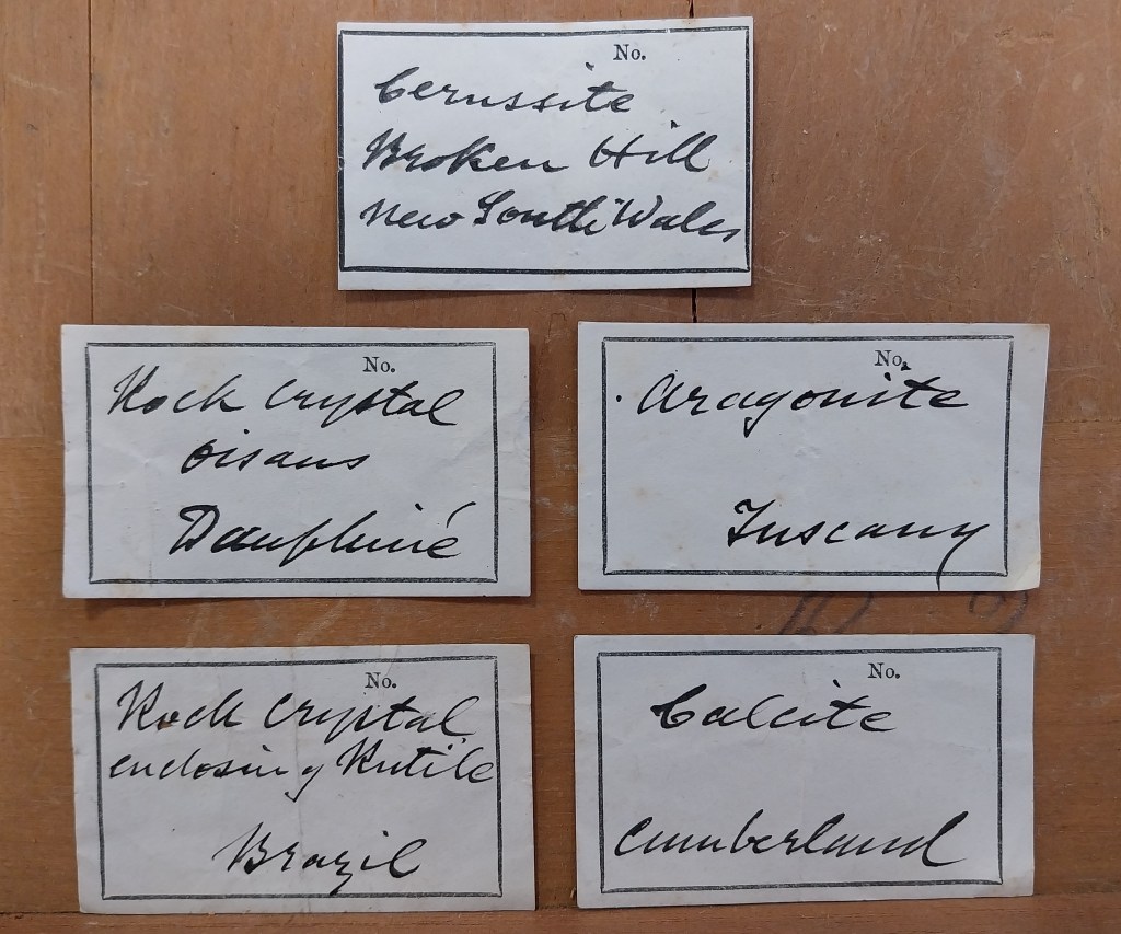 Many of the specimens have Foote labels stuck directly onto them, which include Foote catalogue numbers, identification(s), and some locality information. Many also have a price stuck to the specimen. Note that the Foote catalogue numbers relate to the mineral type, they are not unique to the specimen.