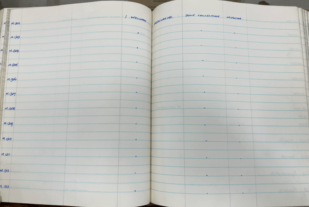 - Joly catalogue/notebook, from 1886, which relates to Beryl specimens from Glencullen, Bray Head Slates (+ Oldhamia and ‘new fossils’), Apatite from Glencree, and Pumice and Dust from Krakatoa.