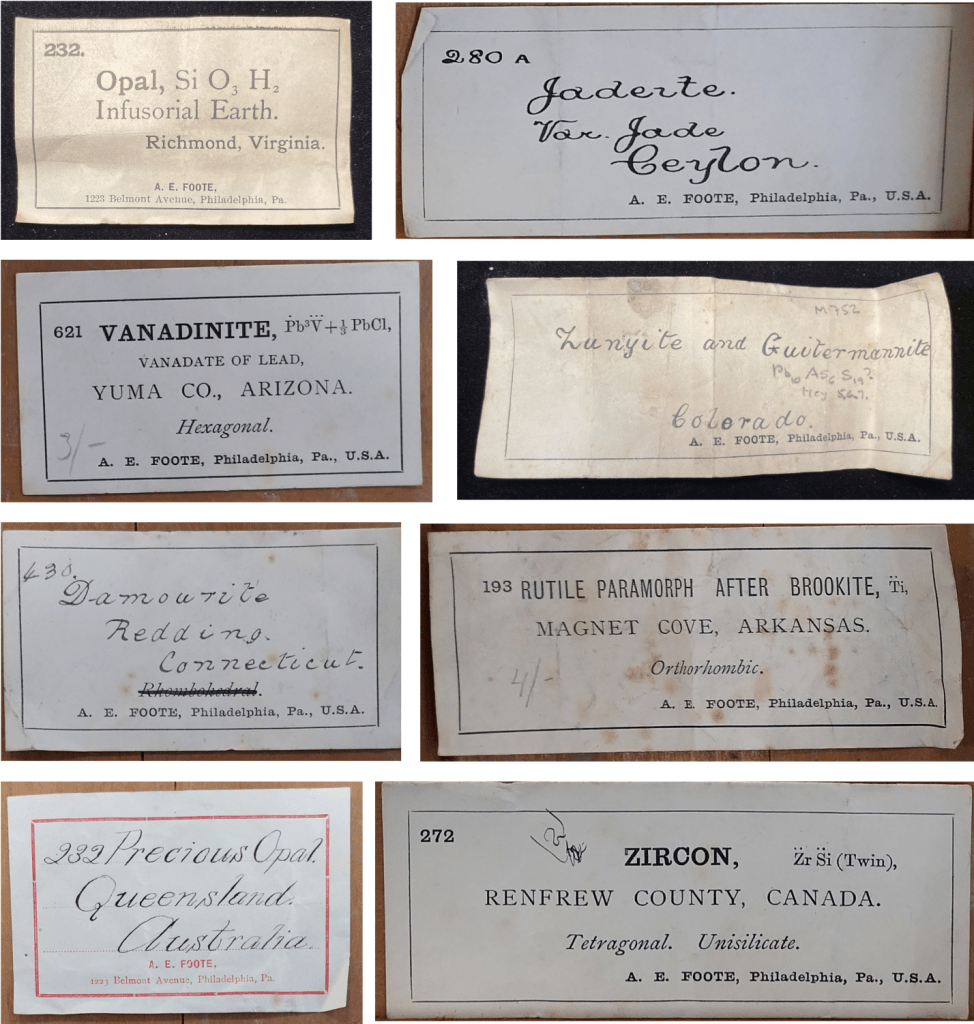 Paper labels for the Foote specimens came in a variety of shapes and styles as illustrated below. In many cases the Foote labels have been separated from the specimens.