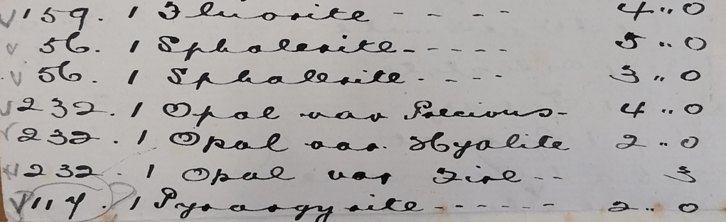 A handwritten document with the collection lists a) Foote numbers b) number of specimens c) mineral name and d) price in £-s-d, for the specimens that Joly bought. A Foote catalogue in the collection, attached in full below, was published by 1897, ten years after Joly’s purchases, but nevertheless giving a valuable insight into the kinds of minerals available and their provenance.